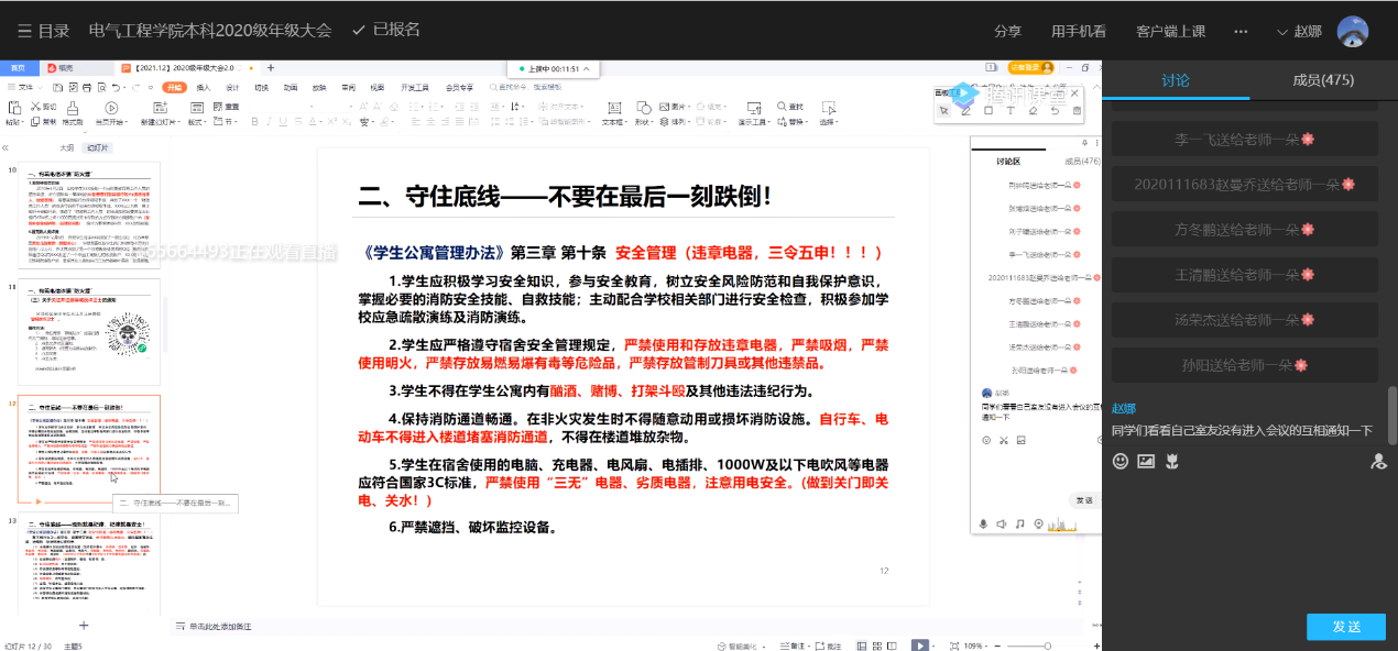 12月5日19时,老王论坛 2020级以腾讯课堂为平台召开了线上年级大会。全体电气2020级同学参加会议,会议由2020级辅导员关怀主持,辅导员郭冰倩、赵娜作补充。