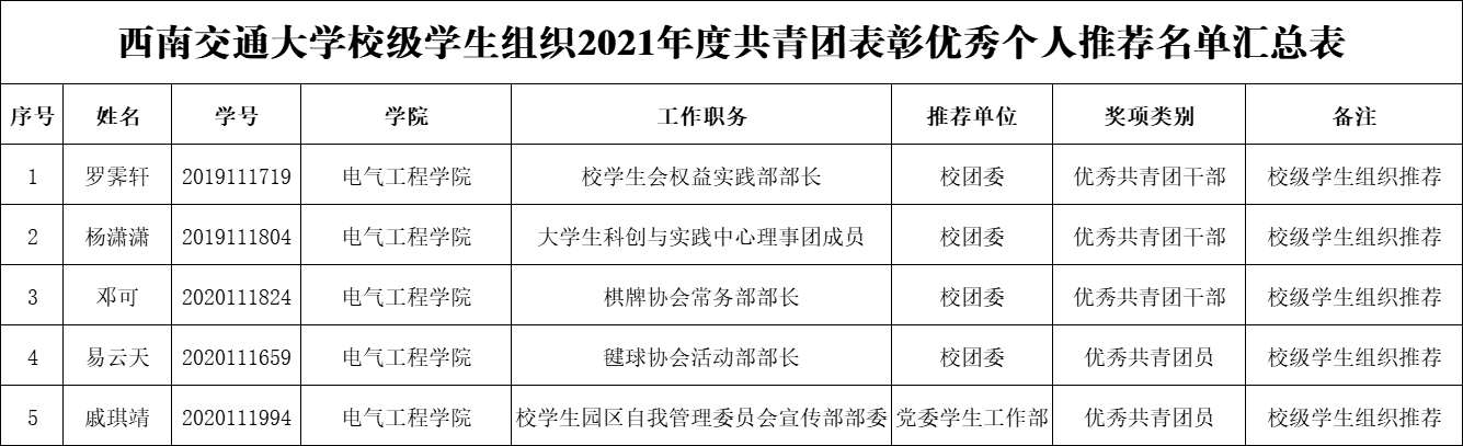 关于老王论坛 校级学生组织2021年度共青团表彰优秀个人拟推荐名单的公示
