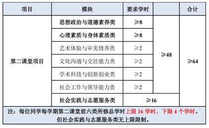 为保证学生合理安排时间,保质保量完成第二课堂,规定学生每学期完成学时上限不超过16学时(社会实践与志愿服务类不做限制),第七学期仍未完成第二课堂毕业要求的本科生,可进行超学时选课申请。