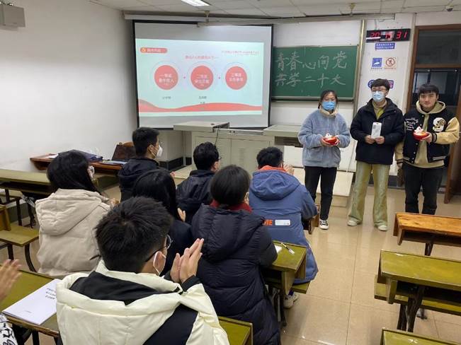 为了检验同学们的学习成果,学习小组于12月9日晚在九里校区开展了“青春心向党 共学二十大”主题知识竞赛活动。竞赛题目由党的二十大报告、党章等内容组成,目的在于引导班级同学原原本本,逐字逐句学习党的二十大报告和党章,学习习近平总书记在党的二十届一中全会上的重要讲话精神,推动党的二十大精神在同学们心中落地生根,开花结果。此次竞赛采用线上PK和线下抢答相结合的方式,按照积分排名高低决出一等奖一名、二等奖两名,并对于获奖同学予以了礼品奖励。