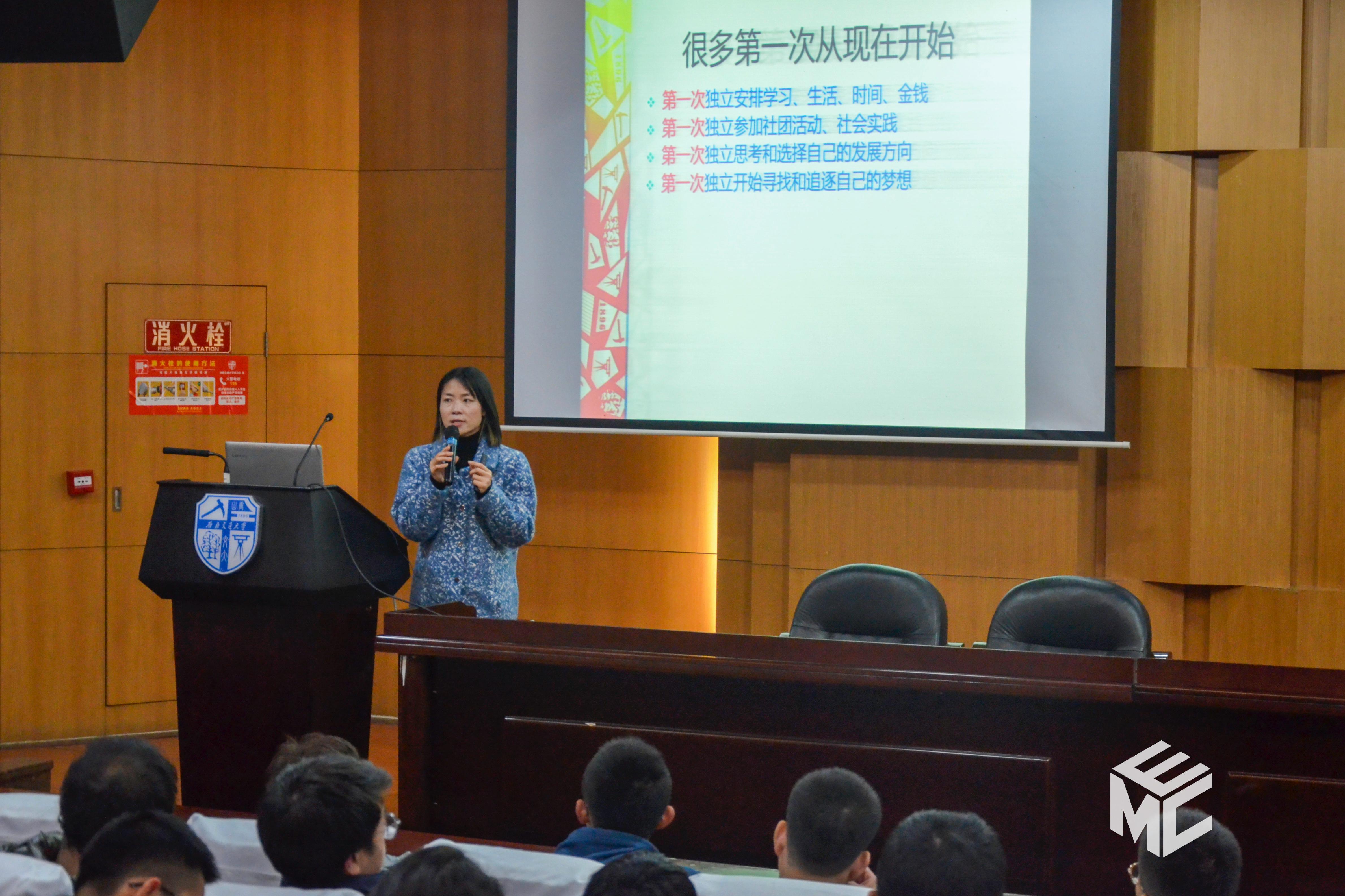 会议一开始,主持人王轶说到“生涯规划不是一种技术,而是一种思想。人世间最大的畏惧是对未来的无知。”主持人联系自身的亲身经历,深入浅出地讲解了生涯规划的重要性。王轶的讲述由高考一直延伸到了在座新生们四年后的大学毕业季,从一张校招双选会的图片展开了对竞争压力的漫谈,她提到,随着大学的扩招和时代的发展,就业市场竞争的激烈程度越来越大,做好生涯规划,知道自己想要什么,想要成为什么样的人,才能在竞争中脱颖而出。她同时也向同学们发出了疑问:“大学下一站会开往哪里,我们到底会走向何方? ”。同学们都陷入了对未来的思考之中。