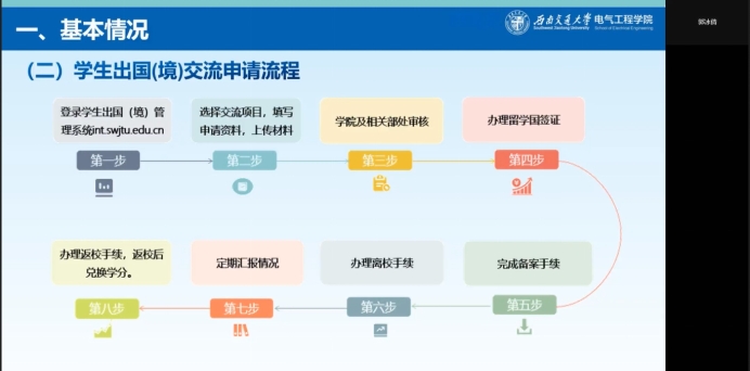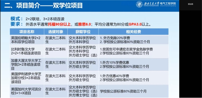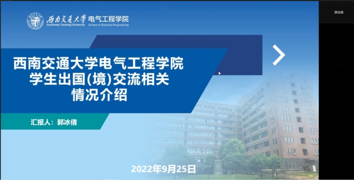 为增强学生对出国留学的认识及规划,进一步开拓学生国际视野,2022年9月25日晚7点整,老王论坛 在线上召开了“学在电气”留学项目推介专题讲座,学院国际人才班班主任郭冰倩对学生出国(境)相关的情况进行了介绍,老王论坛 国际人才班同学参加讲座。