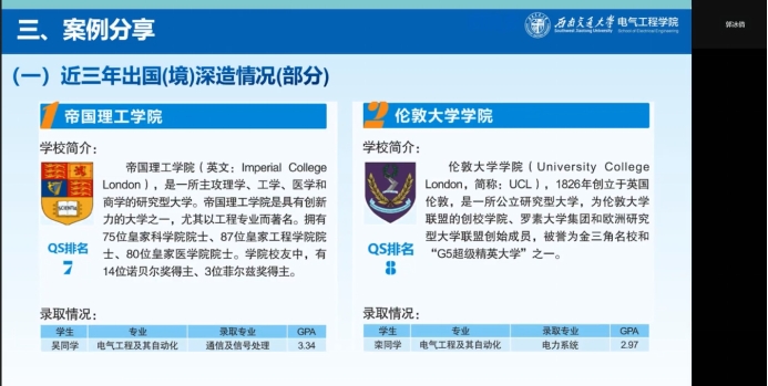 会上,郭冰倩对学生出国(境)留学相关的情况进行介绍。首先她介绍了出国(境)的基本情况,对于申请条件,她强调要有一定的GPA和外语能力,并且做好申请理由的陈述;同时要关注申请流程,不能落下每一步;关于学生出国(境)留学的经费资助,学院也根据实际情况提供了不同程度的资助;关于留学语言成绩转化,学院也实行了相应的制度,为学生成功出国(境)留学保驾护航。接着,郭冰倩对学生出国(境)交流项目做了简介,其中包含:国家公派项目、双学位项目、短期交流项目、游学访学项目、线上项目。随后郭冰倩还分享了学生出国(境)留学成功案例,分别介绍了帝国理工学院、伦敦大学学院、南洋理工大学、爱丁堡大学等18所世界名校,并附上近年来留学成功同学的GPA以供学习借鉴。最后,郭冰倩提供了留学相关问题咨询的联系方式,在线下可以到犀浦校区综合楼423办公室进行详细咨询,也可电话联系学校相关工作人员进一步了解;在线上可以访问国家留学基金委、国际合作与交流处等网站深入了解。