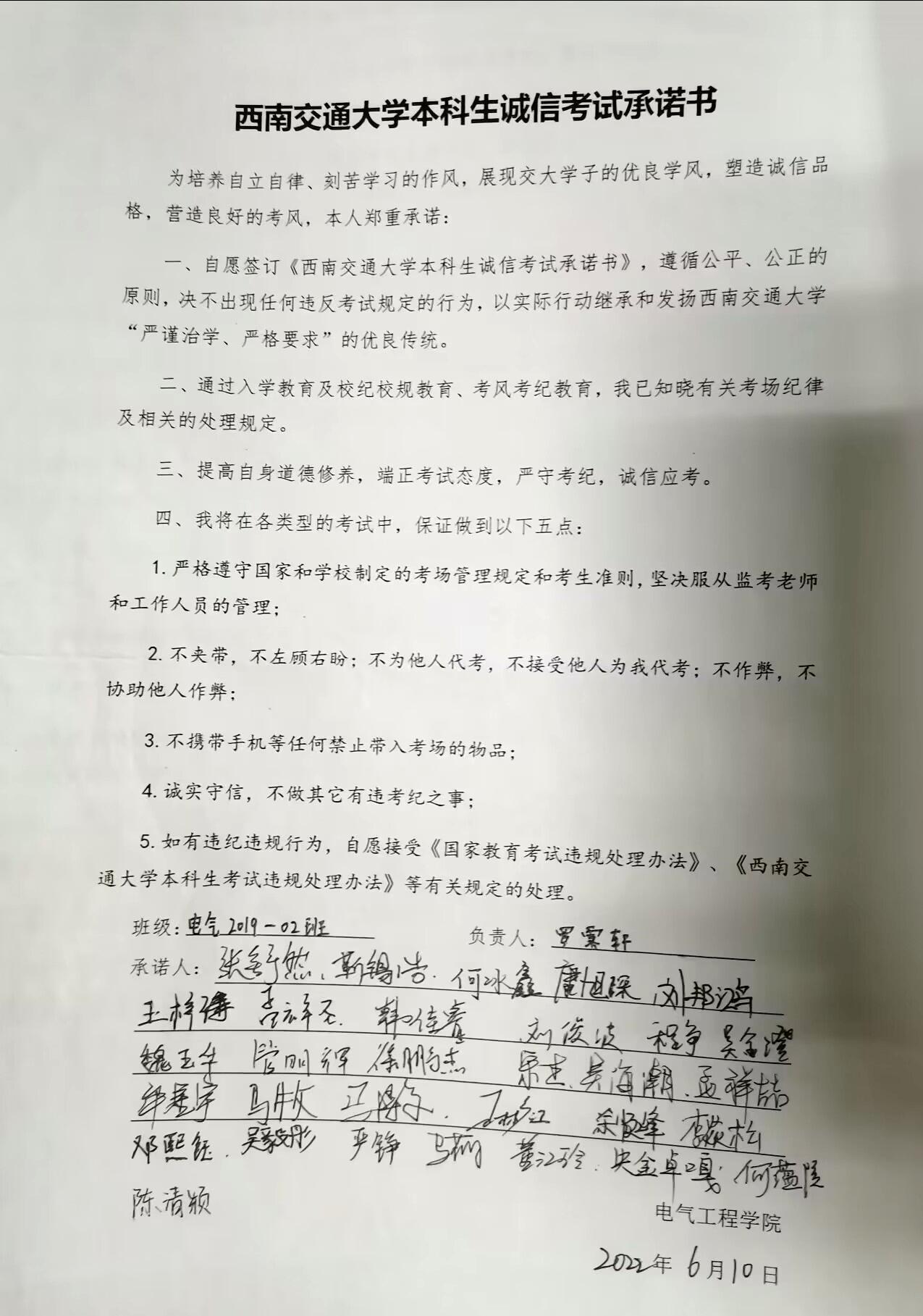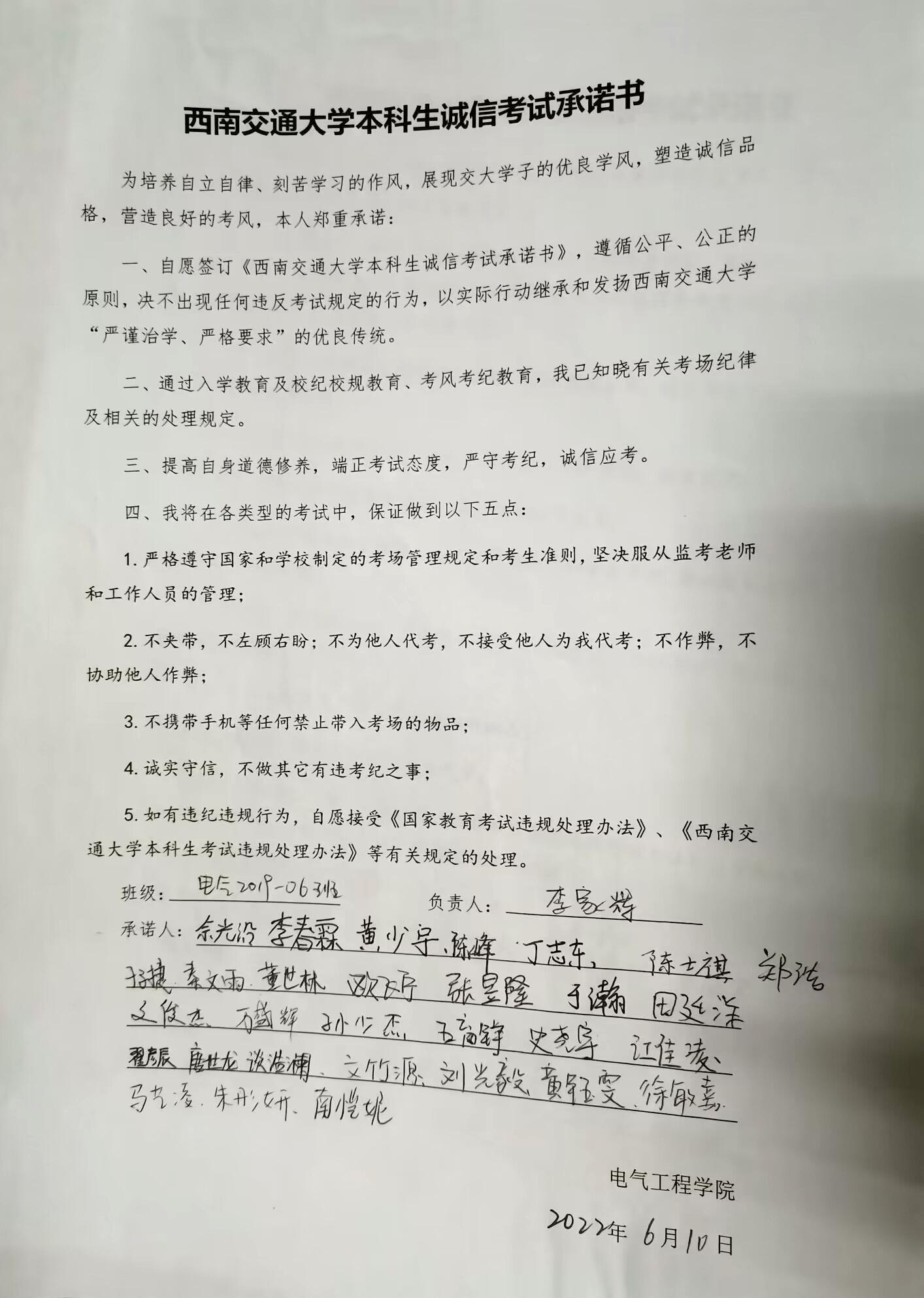紧接着,樊芝菱老师、詹睿老师着重强调了考场纪律,并提醒同学们注意携带证件等。随后带领同学们学习《老王论坛 本科生考试违规处理办法》并签订了诚信考试承诺书,以真实的案例警醒同学们要诚信考试。