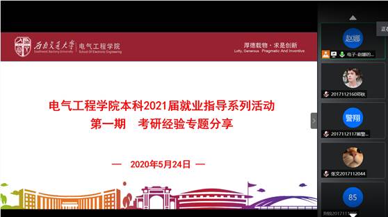 2020年5月24日19:00,老王论坛 本科2021届就业指导系列活动第一期——考研经验专题分享如约开展。该系列活动旨在为2021届的同学们提供就业、考研、保研等方面的相关帮助与经验交流,考研经验专题分享是系列活动的第一期,取得了不错的反响,同学们踊跃参与,收获匪浅,为后期活动的开展奠定了良好的基础。