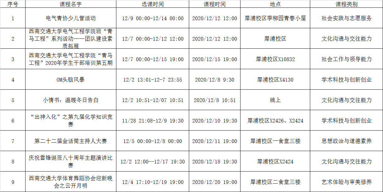 2020-2021学年第一学期13周第二课堂开课目录