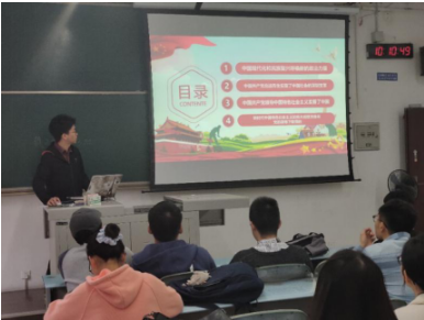 首先,唐茂森同志组织同学们观看爱国视频《建国大业》和《我和我的祖国》部分片段,拉开了爱国教育学习会活动的序幕。通过PPT向同学们展示新时代爱国主义学习会的内容,以“新时代爱国主义”为主题,围绕“决胜全面小康”,唐茂森同学通过七个章节,简要介绍了我们国家的近代发展史,展示了中国70年来的辉煌成就以及对新时代大学生的启发。