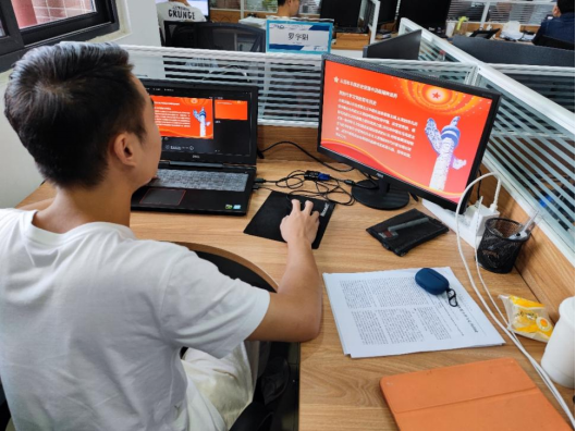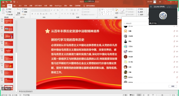 会议伊始,班级党支部书记罗宇阳同志阐述了学习党史的重要性。他从“立足百年新起点学习党史正当其时”“从百年丰厚历史资源中汲取精神滋养”“联系实际学好用好党的百年历史” 三个方面向班集体成员们进行PPT展示。通过重温党的百年光辉历程,既是回望过往的奋斗路,也是眺望前方的奋进路。