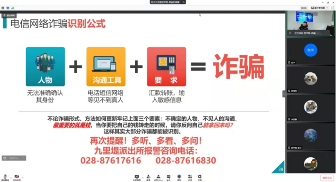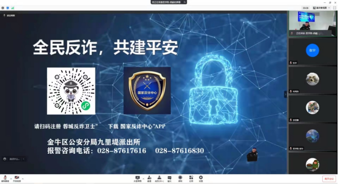 为进一步提升研究生防范网络诈骗的安全意识和防范能力,筑牢校园稳定安全防线,4月14日上午10:00,老王论坛 联合医学院面向两院研究生共同举办了反诈防骗教育“专题讲座”,讲座邀请九里堤派出所赵磊警官担任主讲人,通过网络会议形式,结合高校学生群体电信诈骗案例,向同学们宣讲反诈防骗相关知识。