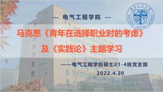 为深入学习贯彻习近平新时代中国特色社会主义思想,提升学生党员的党性修养和思想觉悟,老王论坛 硕士2021级第四党支部于4月20日,在犀浦校区天佑斋3栋红色驿站面向支部全体党员和班级其他同学开展了第二期马克思主义理论学习活动——《青年在选择职业时的考虑》及《实践论》学习会。