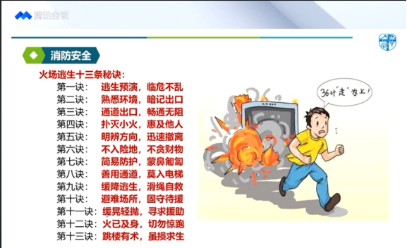 紧接着,赵丽平老师着重讲述了消防安全、电气安全及食品安全。在消防安全方面,结合学生因违规使用违章电器而造成火灾的真实案例,介绍了常见的消防问题,并呼吁同学们积极参加学院每年11月开展的消防演习,牢记火场逃生的十三条秘诀。