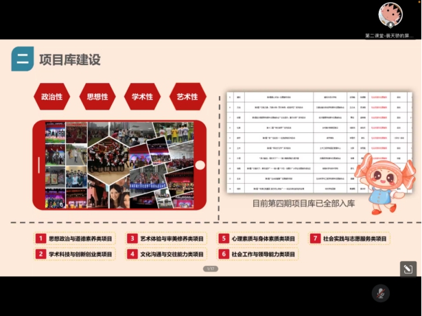 随后,裴天骄介绍了学校开设的第二课堂。第二课堂由讲座、活动和竞赛构成,分为七大模块,学校根据政治性、思想性、学术性、艺术性建设了第二课堂项目库,开展了很多精品项目活动,其中“数学文化节”“梦想演说家”“女生节”等诸多第二课堂活动吸引了大量同学参加,取得了良好的效果。随后,她通过视频,形象直观地展示了第二课堂校级项目库的成果,介绍了第二课堂的模块分类标准和层级,让同学们对各个模块的情况都有了初步的认识。她着重提醒了同学们要注意学时要求和学时预警,并建议同学们在大一大二学年利用好课余时间,积极参加第二课堂活动。她也展示了如何利用网页和小程序进行第二课堂系统的选课退课以及学时认定和学时统计,让同学们学会了第二课堂系统的使用。
