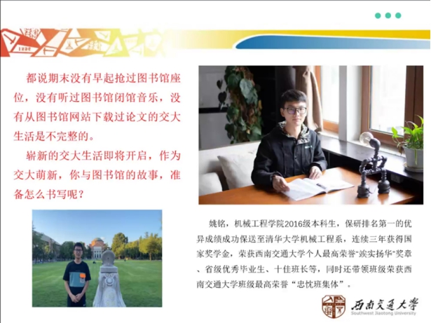 何雪梅老师首先表示,在进入了相较于高中更加轻松的大学,同学们可以选择在图书馆度过自己的大学时光,因为它是一个自由安静的场所,是一个让人了解知识的圣地,更是一个优秀人才的聚集地。接着,她用马克思、毛泽东、莫言等例子来说明图书馆对人的影响十分巨大。同时,她也以我校2016级机械学院姚铭同学积极利用图书馆提升自我,最终保研至清华大学的事迹为例,号召各位同学多多使用图书馆资源,续写人生的新篇章。