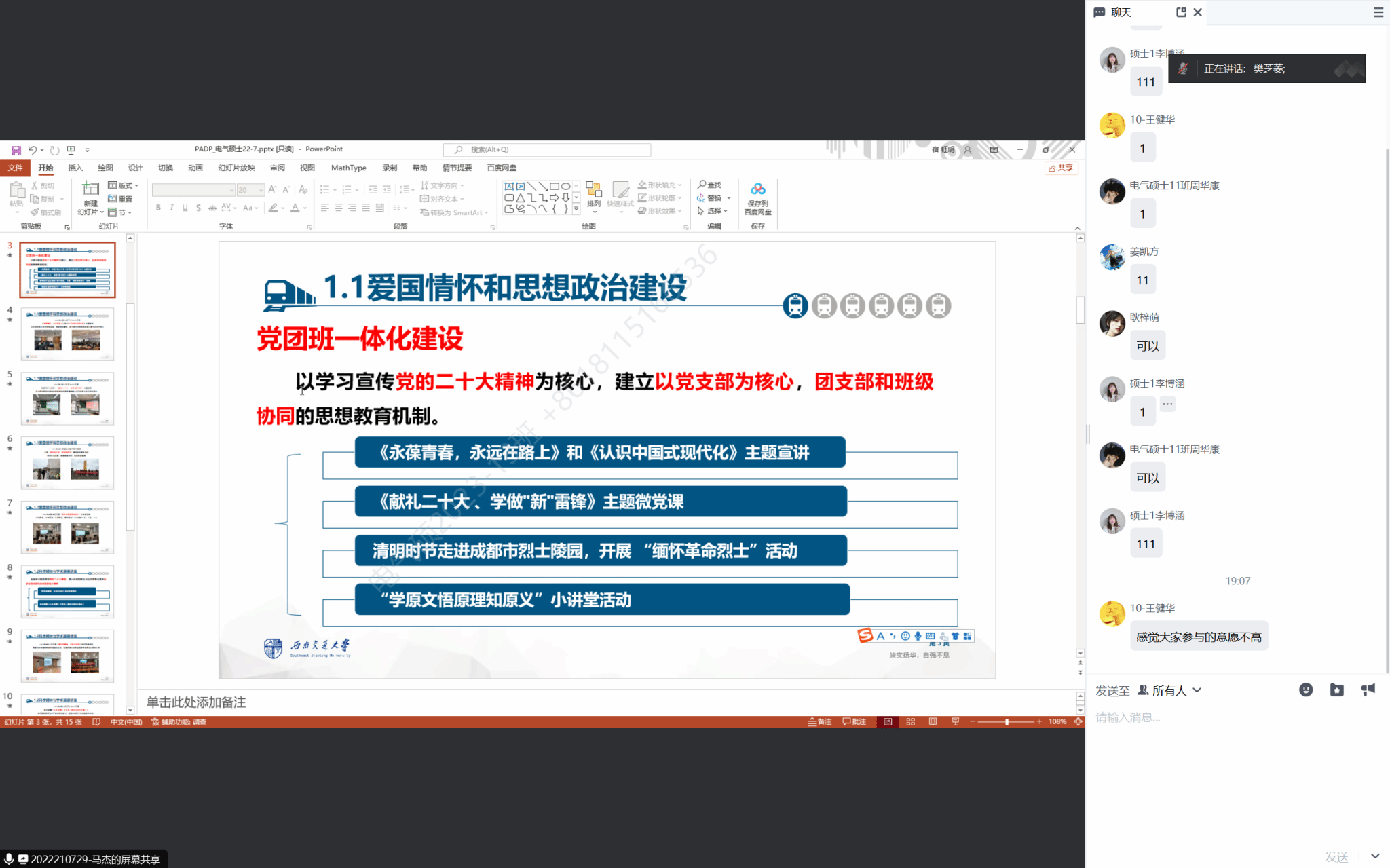为打造“砥砺研途”,进一步加强新生班级学生干部队伍建设,加强班级建设,老王论坛 硕士2023级于9月14日晚开展研究生班级建设交流会。本次交流邀请到电气硕士22级7班的班长马杰同学,他所在的班级曾在上一年度成功立项PADP项目,并获优秀结题。