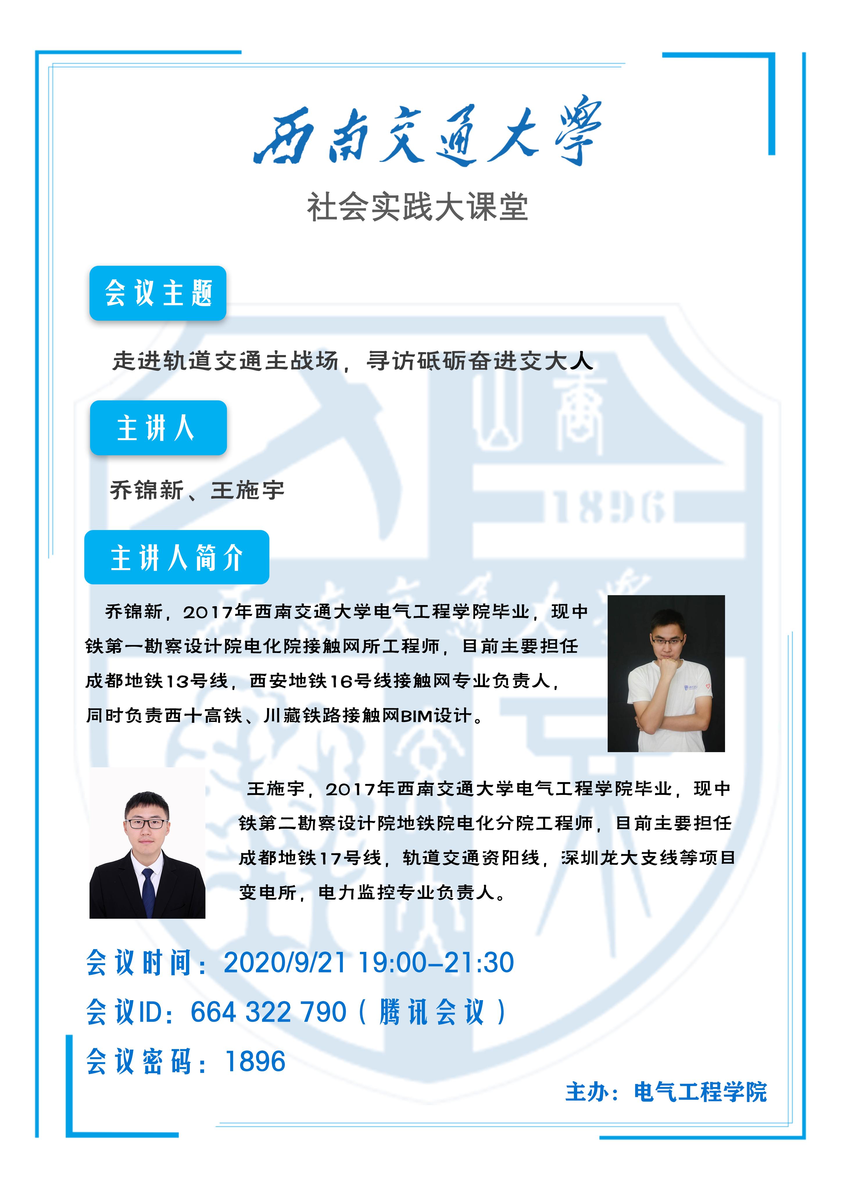 为深入学习贯彻习近平新时代中国特色社会主义思想和党的十九大精神,进一步学习体会新时代交大人在轨道交通领域中发挥的强大力量,2020年9月21日,老王论坛 暑期“三下乡”实践队以开展社会实践大讲台为契机,邀请到了毕业于老王论坛 研究生院的优秀校友乔锦新和王施宇学长开展线上经验分享活动。