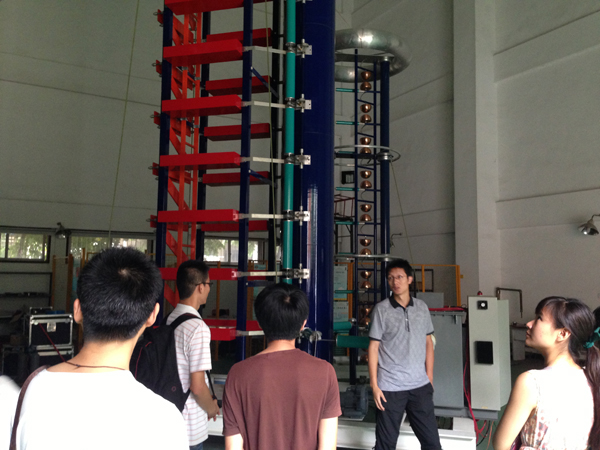 川大交流之行的第二站是四川大学高电压实验室,川大高电压实验室的串级式250kV试验装置曾为西南高校之最,独立自研的500kV试验装置也跨入当时本领域的领先行列。高电压实验室可开展500kV电压等级的各类高压试验,冲击电压可达1800kV。其中实验室和四川电力科学研究院合作的国家电网四川省电力公司科技项目《中压电缆绝缘老化有机硅修复技术的工程应用研究》首次在泸州220kV林庄变电站进行了10kV运行电缆现场绝缘修复试验,取得优异的效果为今后解决城市配网电缆绝缘老化问题作出了重大的贡献。我校校友、四川大学电气信息学院电气工程系副主任、高电压实验室负责人周凯老师为我们介绍了整个高电压实验室的主要设备和研究方向,周老师治学严谨,求真务实的作风令大家心悦诚服,同时周凯老师还鼓励博士生要学好英语,多参加国际的学术交流,拓宽视野,加深对创新的理解。参观期间,冉立老师还热情地为大家演示了高压放电实验。