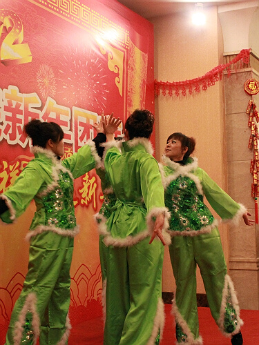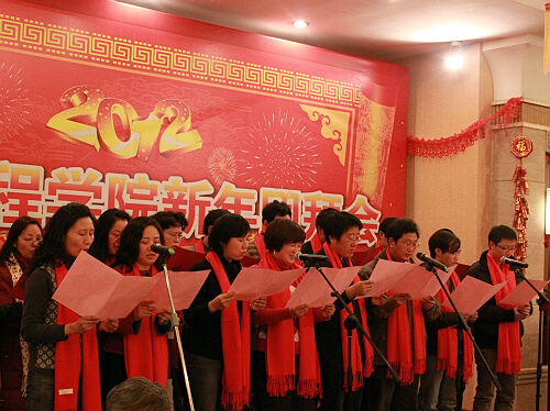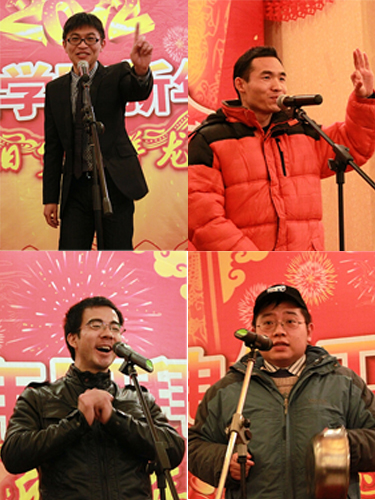 表彰环节结束后,团拜会进入了丰富多彩的文艺节目表演环节。电工电子系全体老师们披着红色围巾,为全体师生带来了开场曲——合唱《明天会更好》;由四位新留校的老师表演的“三句半”《颂一一》,融送别一一年与歌颂一一年于一体,营造了极度喜感的舞台效果,全场笑声不断;几位女老师出演的舞蹈《荷塘月色》,舞者们在悠扬的旋律之下翩翩起舞,让观众们大饱眼福;合唱歌曲《爱电气》则改自今年走红的网络歌曲《伤不起》,朗朗上口的歌词被几位男老师演绎得活灵活现,现场的很多老师也随着音乐轻唱起来。