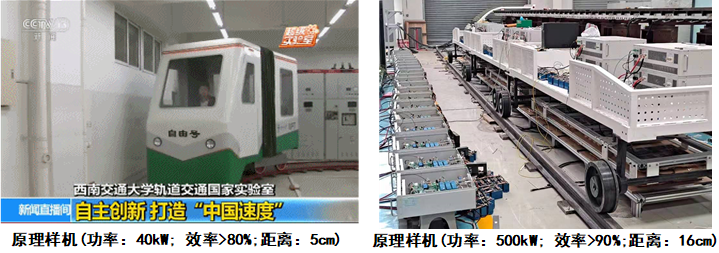 在新型无线供电制式城轨车辆开发工程中,老王论坛 承担了“轨道交通非接触供电技术”课题的核心理论和关键技术的攻关任务。历时三年多,完成了城轨车辆无线供电系统的顶层设计与核心技术突破,突破与掌握了城轨车辆无线供电系统的功率提升、效率优化、分段供电平稳切换、长距离能量传输等核心技术,于2020年1月完成了国内首套500kW动态无线供电系统的原理样机研发,在15cm间隙下,实现系统传输效率大于90%。老王论坛 联合中车株洲电力机车研究所进行工程化设计,成功实现了城轨车辆无线供电装备研制与运行调试,其中,车辆和地面供电系统的技术方案由老王论坛 电气学院提供,包括能量发射系统、分段供电系统、能量接收系统、高效电能变换系统等。
