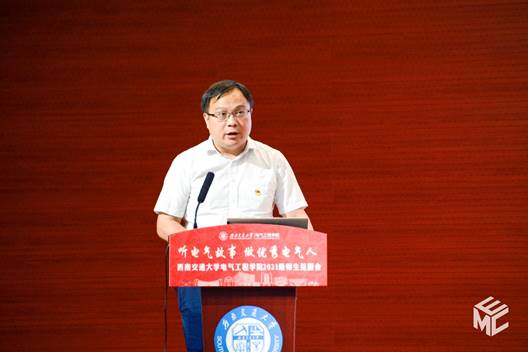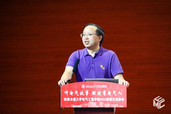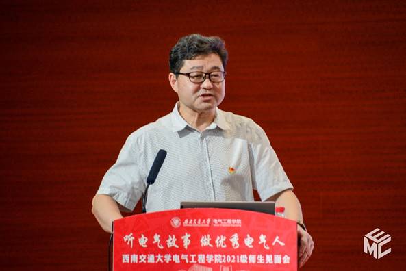陈维荣讲述《文脉悠远,电气之光》的故事,介绍学院的发展历程。陈维荣首先向电气学子们介绍了学院的历史发展并展示了学院在铁路电气化领域创造的众多杰出的成果。紧接着介绍了学院学科和专业的具体内容、丰硕的人才培养改革成果以及近年来学院科学研究所取得的成果。在提到人才培养的时候,陈维荣表示同学们应该首先以课程学习为主,专注基本课程的学习,但也希望同学们能够积极参加各种学科竞赛,培养自己的思考能力。最后,陈维荣向2021级新生们提出寄语,希望同学们传承“厚德载物,求是创新”的电气精神,脚踏实地、行稳致远,练就过硬本领,学以成材,学以报国,以不懈奋斗擦亮青春底色、叩响未来之门!
