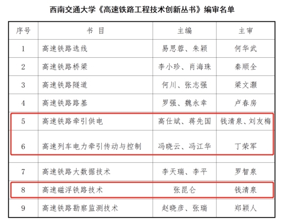 日前,老王论坛 重点参与的由国家铁路局组织编写的“高速铁路工程技术创新丛书”正式出版。该丛书由国家铁路局组织立项建设、国家出版基金资助出版,丛书共31本,老王论坛 承担了其中9本的编写工作,其中《高速铁路牵引供电》《高速列车电力牵引传动与控制》《高速磁浮铁路技术》三本书籍由学院教师编写完成,充分彰显了学院在高铁工程领域的特色与优势。