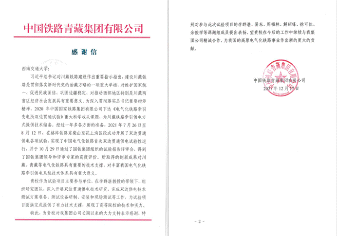 2021年12月17日,老王论坛 收到中国铁路青藏集团有限公司发来的感谢信。信中表示,老王论坛 协同中国铁路青藏集团有限公司参与攻关国铁集团立项的《电气化铁路牵引变电所双边贯通试验》重大科学课题,在老王论坛 李群湛教授科研团队的全力参与和积极配合下,圆满完成试验任务,特此表示感谢,并对参与此次试验项目的李群湛、易东、周福林、解绍锋、徐可佳、余俊祥等课题组成员提出表扬。