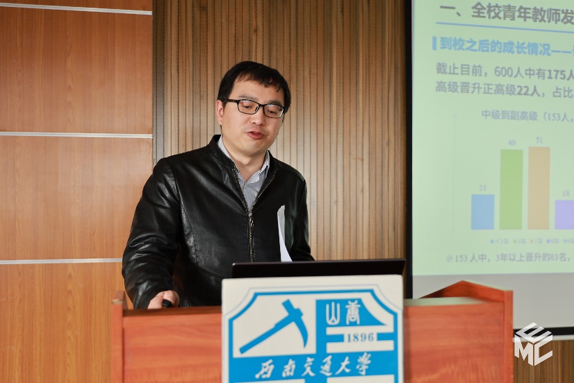 接着,胡海涛对青年教师的工作情况进行了具体分析。首先,他概括了全校青年教师的发展状况,分别从形势政策、基本情况、科研情况、职称分布、晋升情况以及人才情况进行分析。随后,他提到人才发展规律,指出关心年轻人是人才发展强校战略的重要举措,只有更多地关注青年教师,他们才能更有干劲,更能担当中国铁路建设的重任,更能挑起学院发展的大梁。之后,他总结了青年教师发展面临的困境:未融入团队、研究方向不契合、无青年基金、无实验设备场地等困难。对此,他提出了学院的举措与建议:学院人才工作组要给予青年全方位的服务,发布师资、人才招聘信息,接受海内外优秀教师、博士/博士后求职简历,加强海外优青、海外青年博士的联系引进工作,切实保障新进青年、专职博士后的交流和帮扶工作,同时确保引进人才的科研、招生、办公场地等事宜。最后他希望通过学院的支持帮助,青年教师能够激发内在动力,未来能够更好地发展。