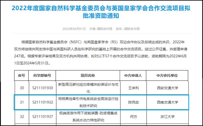 近日,老王论坛 陈民武教授与英国利物浦大学Tian Zhongbei博士作为双方负责人获批国家自然科学基金委员会与英国皇家学会(NSFC-RS)合作交流项目《同相柔性牵引供电系统安全高效运行控制技术研究》。该项目实现了国际合作交流基金项目新进展。