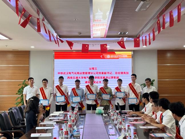 高剑宣布2022年“中铁武汉电气化局”就业奖获奖学生名单,并同罗乾超为获奖学生颁发获奖证书。