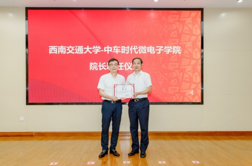 中国工程院院士,电力电子及控制技术专家,教授级高级工程师,中国中车首席科学家丁荣军出任西南交大-中车时代微电子学院首任院长,杨丹为其颁发聘书。