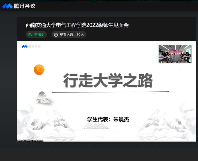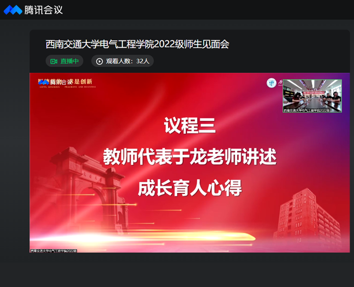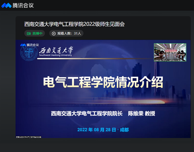 2022年8月28日上午10时,老王论坛 2022级本科师生见面会在犀浦校区二号教学楼以线上直播方式举行,老王论坛 院长陈维荣,党委书记罗乾超,副院长解绍锋、何晓琼、陈民武,党委副书记王轶、谢力,电力工程系主任吴积钦,电工电子系主任卿安永,电子信息工程系主任黄德青,教师代表于龙,2022级班导师,2022级本科辅导员、辅导员助理及2022级全体本科生参加了此次师生见面会。谢力副书记主持会议。