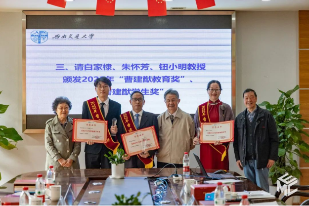 随后举行2022年“曹建猷教育奖”“曹建猷学生奖”的颁奖仪式。白家棣教授、朱怀芳教授、钮小明教授分别为“曹建猷教育奖”获奖代表赵丽平老师、蒋朝根老师,“曹建猷学生奖”获奖代表万志强同学颁奖并合影留念。获奖老师代表发表感想:感谢理事会能将这份荣誉授予自己,这将继续激励他们在曹院士勇于担当、开拓创新的精神指导下为铁路电气化和自动化事业努力奋斗,再创辉煌。获奖学生代表对曹建猷科技教育基金委员会表达了感谢,他将秉持一颗为国为校奉献自我的赤诚之心,继续奋斗在轨道交通行业中,为中华民族伟大复兴奉献自己的一份力量。