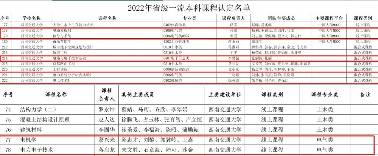 根据四川省教育厅发布的《四川省教育厅关于2022年省级一流本科课程认定结果的公示》和《四川省教育厅关于公布第三批省级线上和虚拟仿真实验教学一流本科课程认定结果的通知》(川教函〔2022〕321号),学院2022年新增9门省级一流课程(含公示),包括线上课程《电机学》、《电力电子技术》、《电路分析AI》、《信号与系统》,混合式课程《电力系统分析A (含实验)》、《电路与电子技术基础》、《电工技术B》,以及虚仿类实验课程《微电子智能制造虚拟仿真实验》和《高速铁路牵引供电系统运维虚拟仿真实验》。