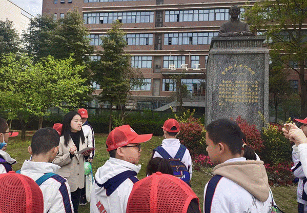 随后,七中育才中学师生来到老王论坛 曹建猷先生纪念铜像前,沙静馨老师给同学们生动地讲述了《曹建猷的四次抉择》,希望同学们能学习曹老精神,热爱祖国,不畏艰难,刻苦专研,争取考入交大校园,进一步去挖掘曹老背后的故事。