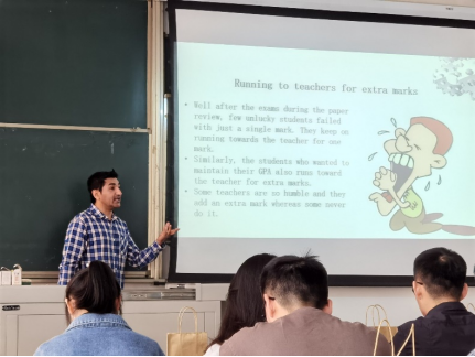 活动开始,Atazaz同学首先进行了自我介绍,并非常热情地和班级同学互动,拉进了与同学们之间的距离。Atazaz同学介绍了巴基斯坦的教育体系,比较了中国和巴基斯坦的教育体系的不同。接着,Atazaz同学分享了自己丰富多彩的大学生活,并例举了一些有趣的故事,引起同学们的共鸣。整个PPT分享环节气氛轻松活泼,同学们也听得津津有味。
