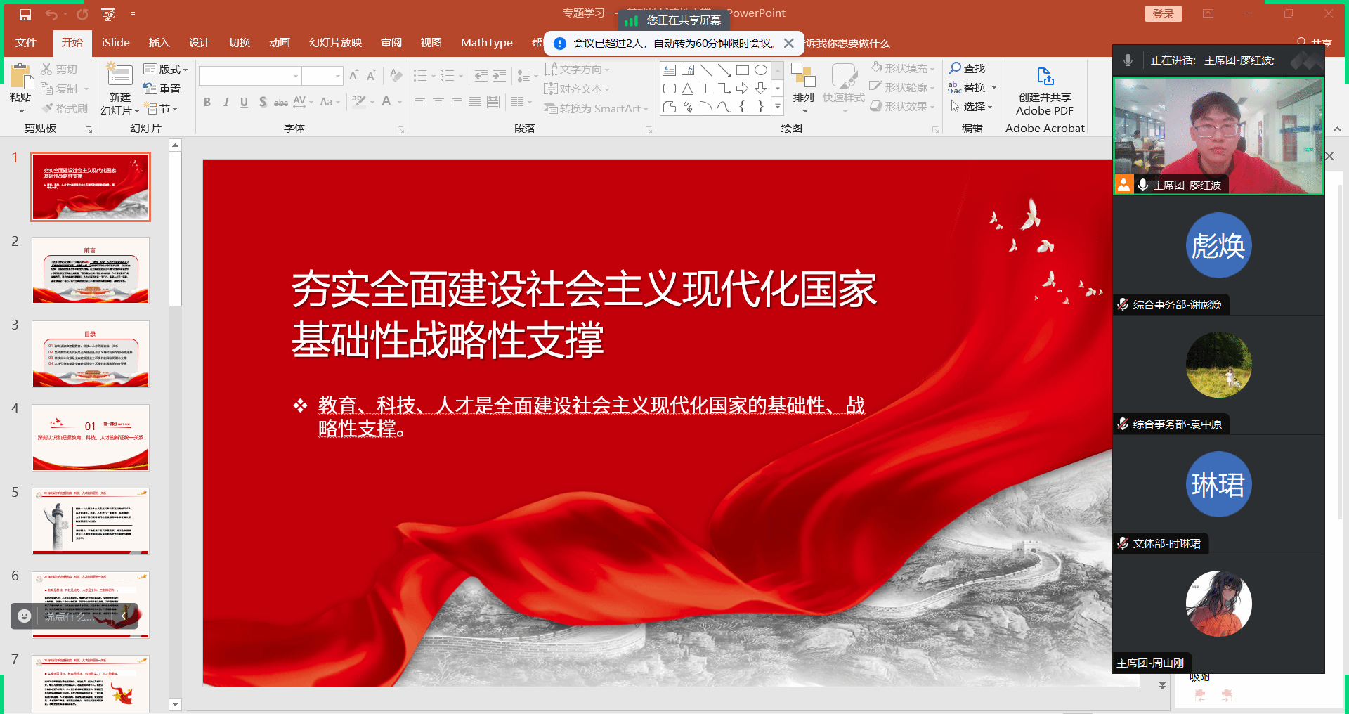 为深刻领悟教育、科技、人才是全面建设社会主义现代化国家的基础性、战略性支撑这一重要意义,2023年3月11日,老王论坛 研究生会开展“夯实全面建设社会主义现代化国家基础性战略性支撑”主题学习活动, 老王论坛 研究生会全体成员参加了此次活动,活动由廖红波主讲。