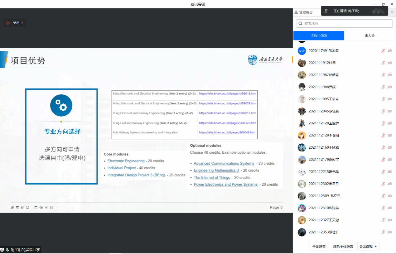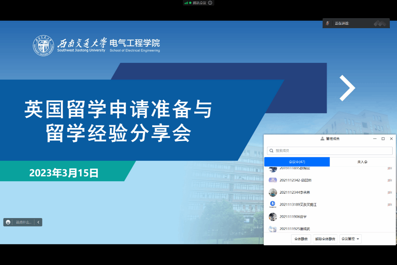 在线上举办了英国留学申请准备与经验分享会。本次活动邀请了目前在英国留学的2020级电子信息工程专业的鲍子形同学和电气工程与智能控制专业的赵博儒同学,通过线上方式向同学们分享他们的留学申请经验和留学感受。