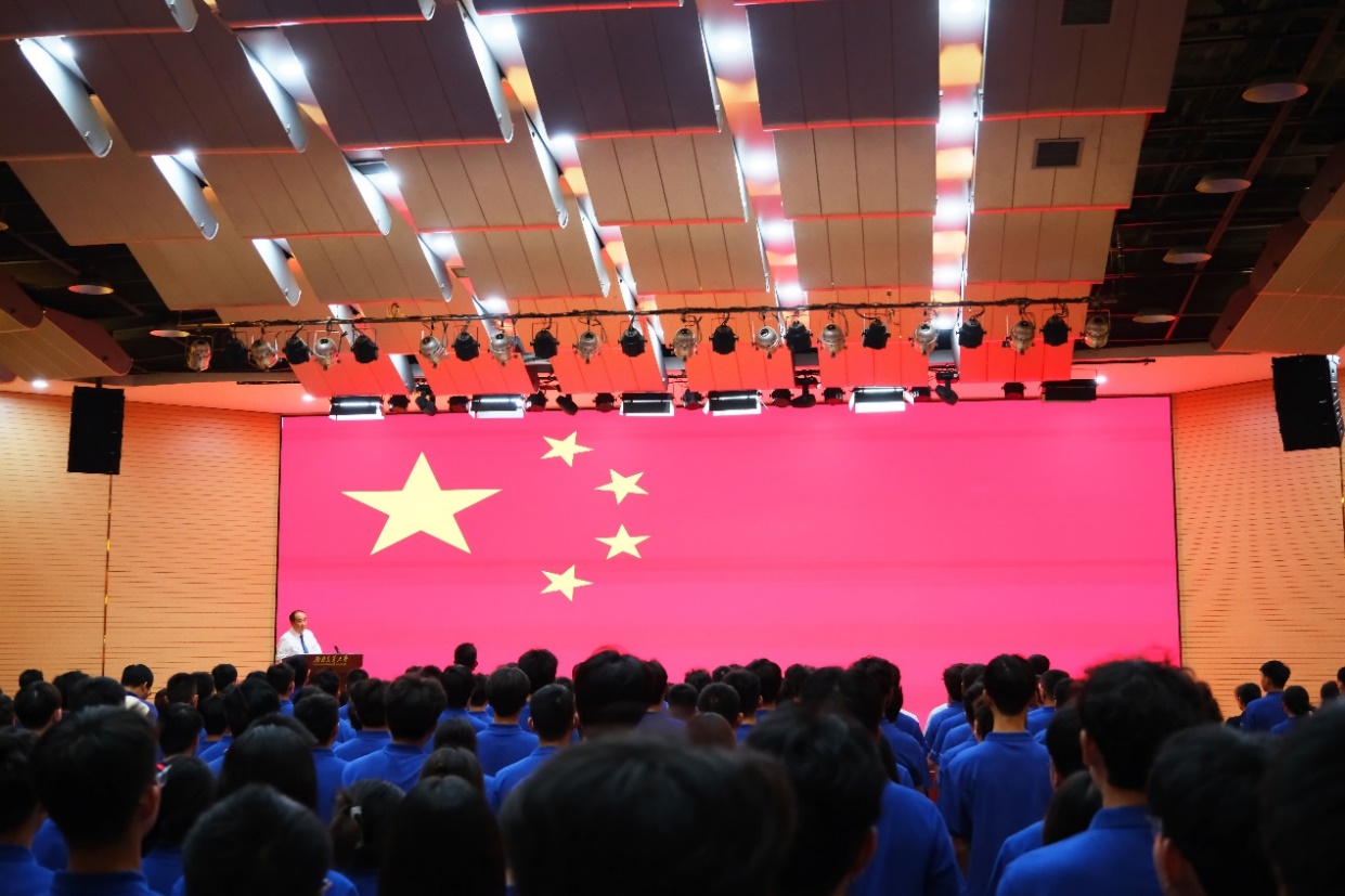 典礼伊始,全体师生面向国旗行注目礼,并齐唱国歌。
