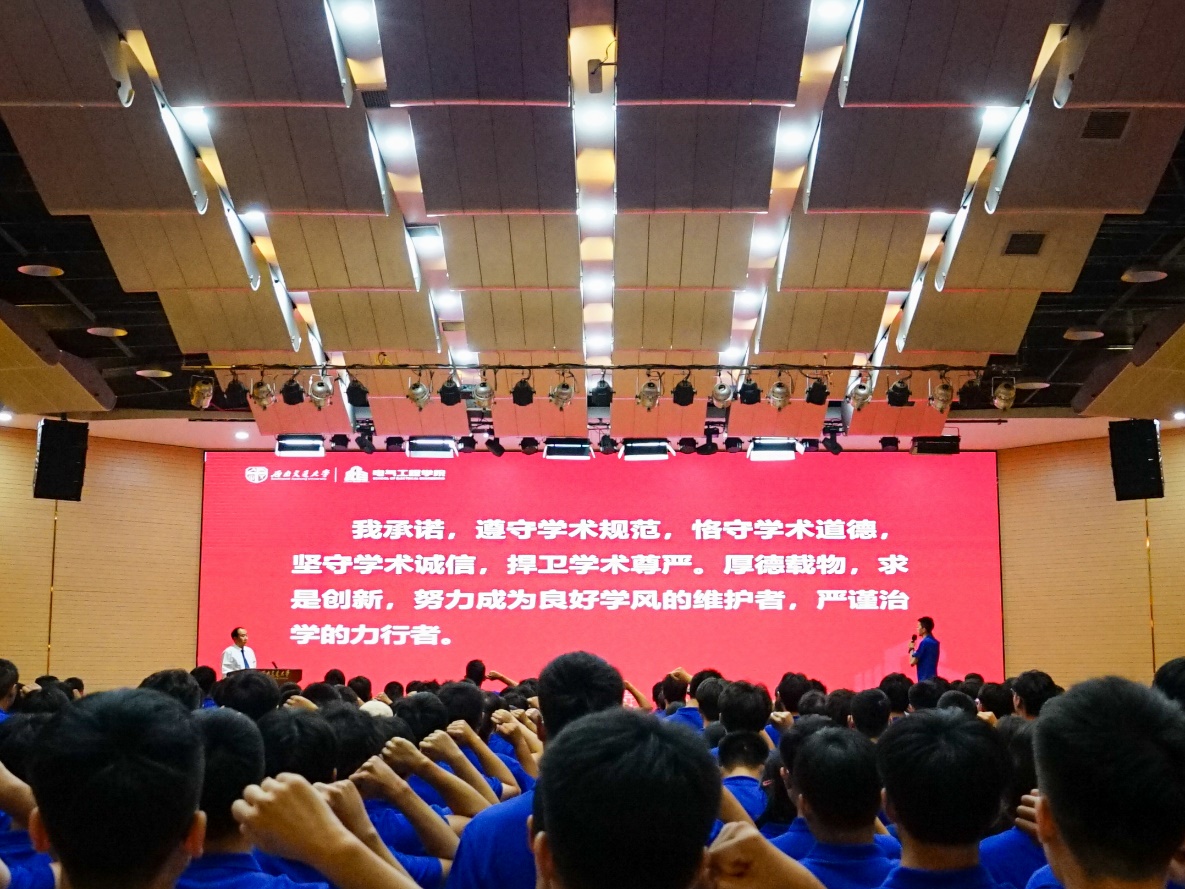 最后是学术诚信宣誓环节。硕士2024-03班田小宇同学上台领誓,全体研究生庄严宣誓:“我承诺,遵守学术规范,恪守学术道德,坚守学术诚信,捍卫学术尊严。厚德载物,求是创新,努力成为良好学风的维护者,严谨治学的力行者。”