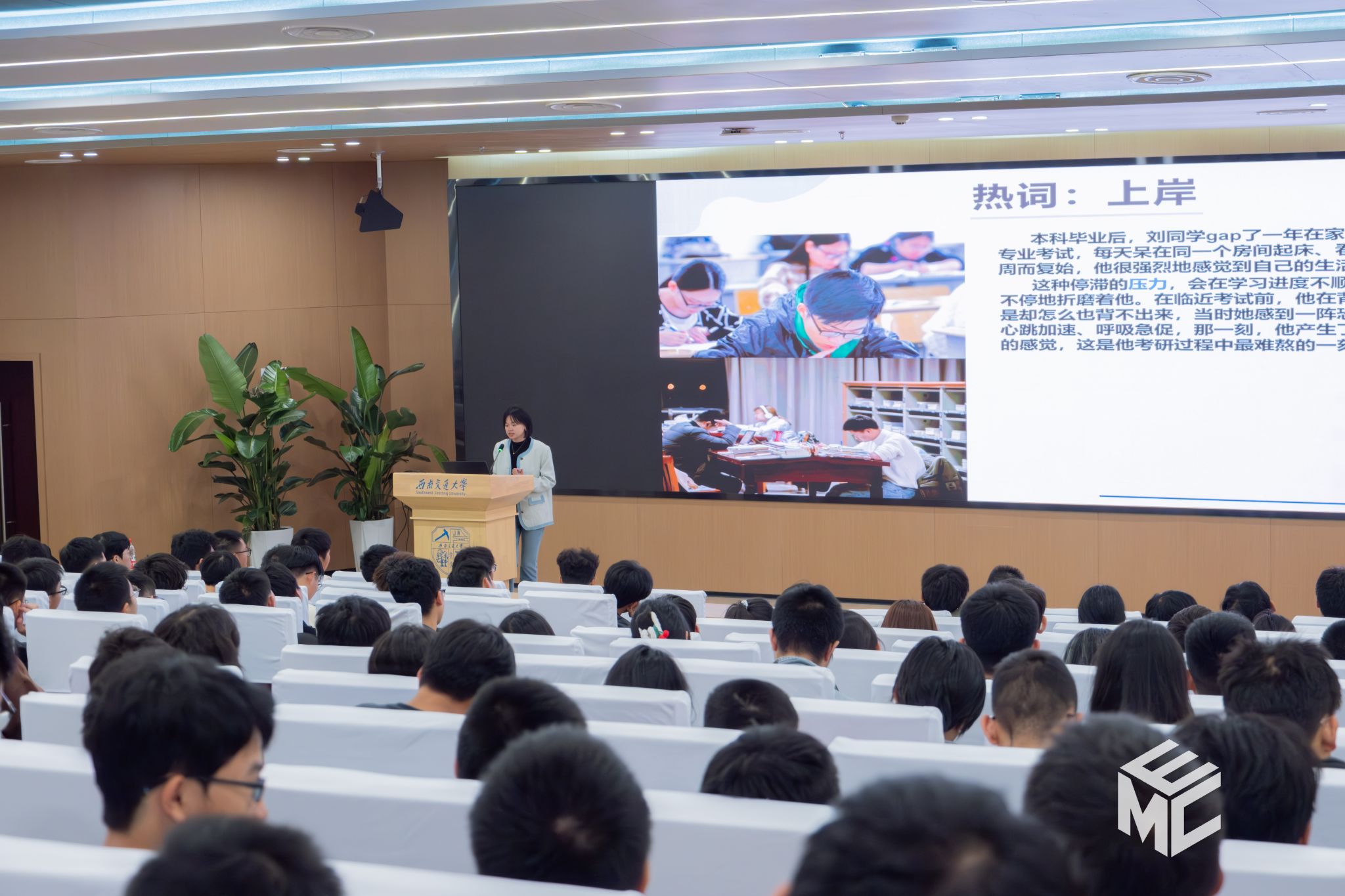 樊芝菱老师首先分析了当前的大学生就业形势,强调生涯规划不仅仅是选择职业的过程,更是认识自我、明确方向、实现人生价值的重要途径。此外,樊芝菱老师从不同的角度讲解了现阶段的社会需求,针对同学们不同的职业发展方向,如考研深造、出国留学、进入企业就业、自主创业等给出了具体的规划建议。