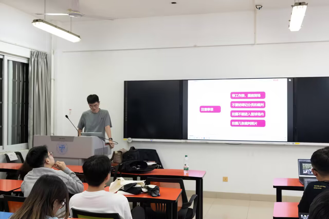 体育部:精进赛事组织能力,保障活动专业性。体育部培训重点聚焦于篮球赛和匹克球赛等的组织与裁判技术工作。培训内容涵盖了比赛规则深度解读、赛事流程规范化管理、常见突发情况应对预案以及运动损伤的初步处理等。通过理论与实践相结合的方式,部员们不仅巩固了专业知识,更提升了在具体赛事中担任技术裁判、维持比赛秩序、保障参赛者安全的能力,旨在为学院师生呈现更加专业、公正、安全的体育竞技平台。