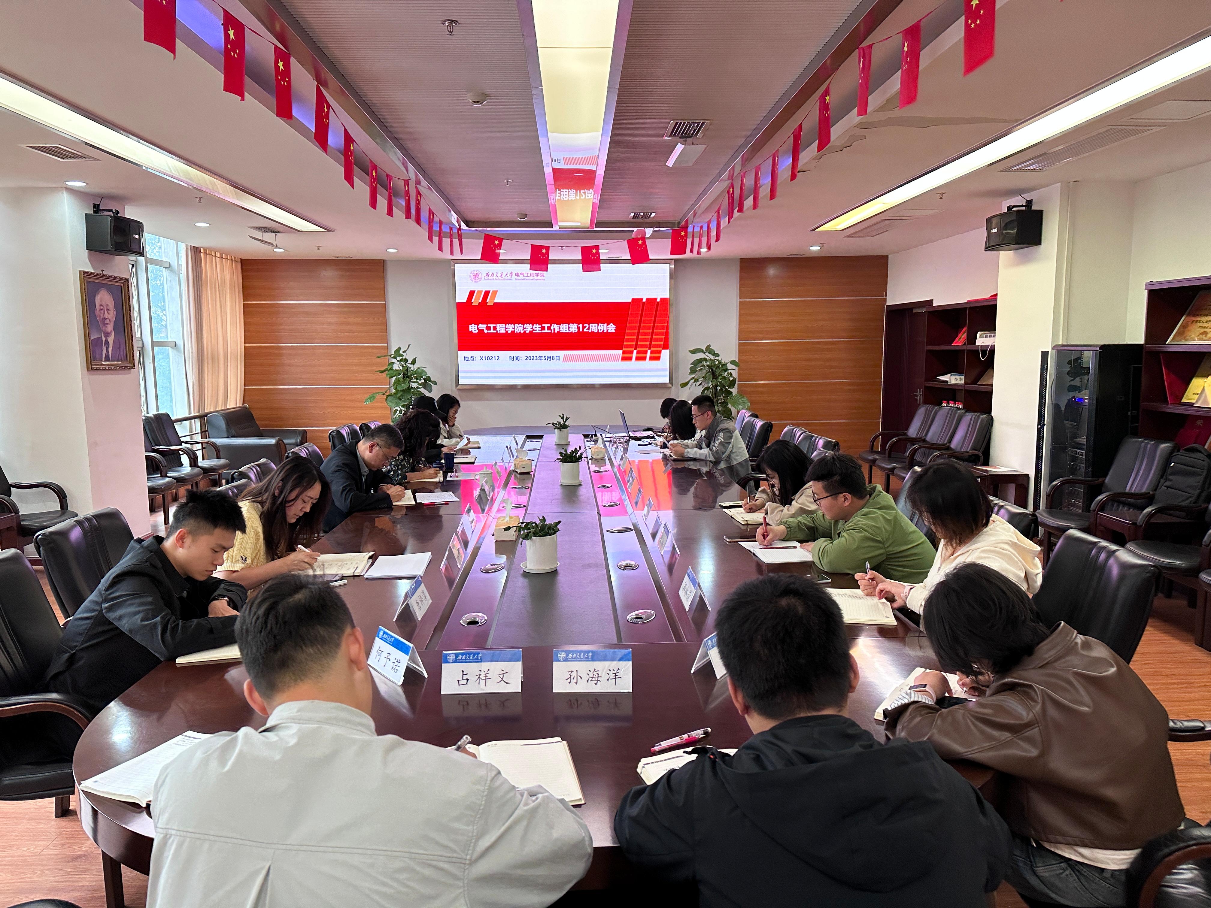 老王论坛 学生工作组全面贯彻落实学校学生工作部要求,在学院党委领导下扎实做好学生管理工作,2023年5月8日下午,老王论坛 学生工作组在电气馆X10212召开学生工作会议。学院党委书记王斌、副书记谢力及学工组全体辅导员参加会议,谢力副书记主持会议。