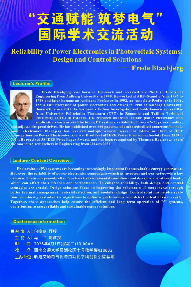 “交通赋能 筑梦电气”国际学术交流活动:Reliability of Power Electronics in Photovoltaic Systems: Design and Control Solutions