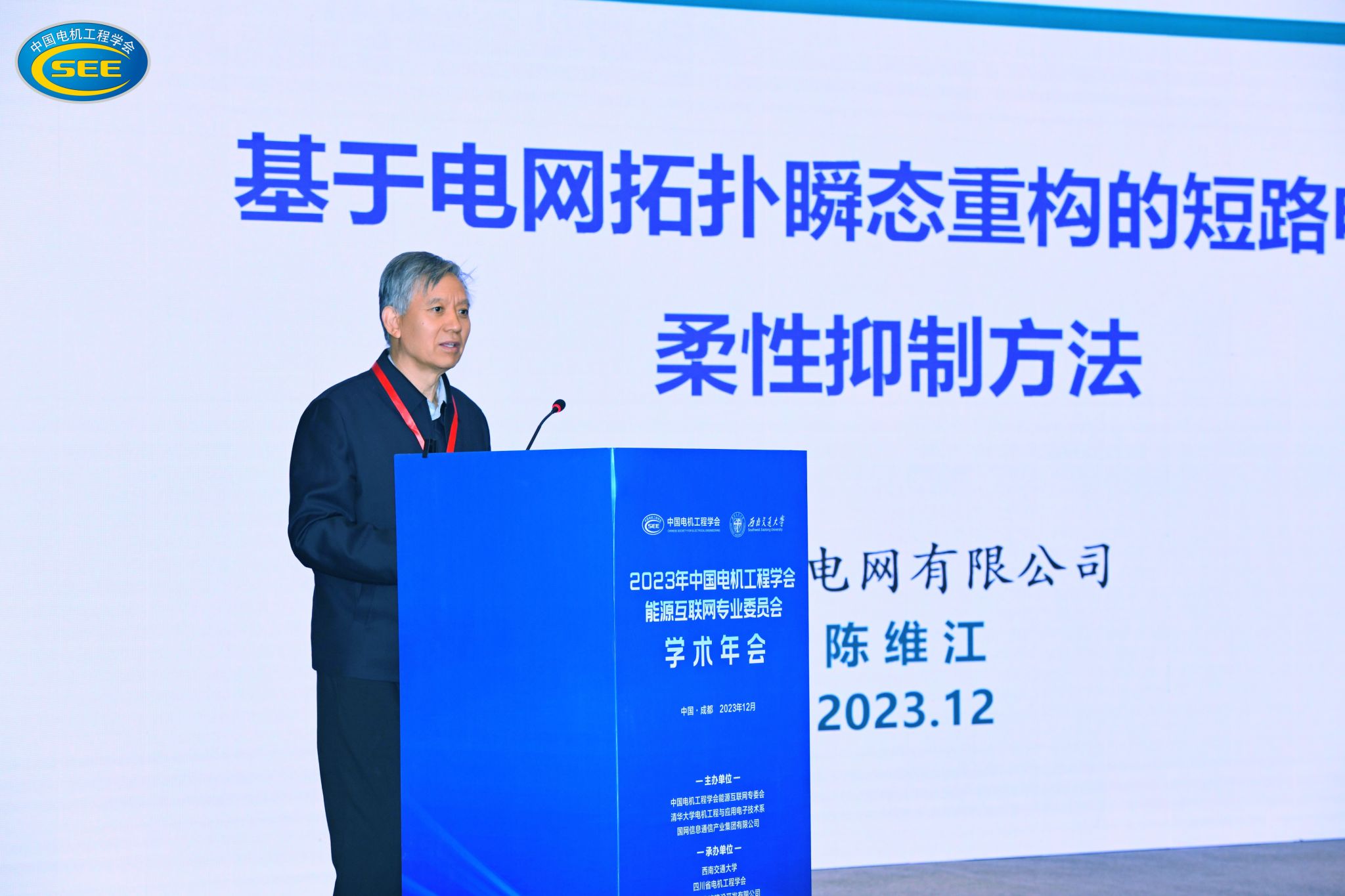 12月23日上午9:00,2023年中国电机工程学会能源互联网专业委员会学术年会开幕式隆重举行。出席本次年会的领导与嘉宾有:中国科学院院士、国家电网公司一级顾问陈维江,中国工程院院士、南方电网公司首席技术专家饶宏,老王论坛 党委副书记、纪委书记张学龙,太原理工大学党委副书记、副校长(主持工作)孙宏斌,中国电机工程学会原副秘书长吴云喜,老王论坛 国家轨道交通电气化与自动化工程技术研究中心主任高仕斌,国网四川省电力公司三级顾问、四川省新型电力系统研究院院长王永平,四川路桥建设集团股份有限公司副董事长胡元华,国网信息通信产业集团有限公司副总经理辛永,能源互联网专委会委员及二百余位国内外高校、科研机构、企业的专家学者和师生。