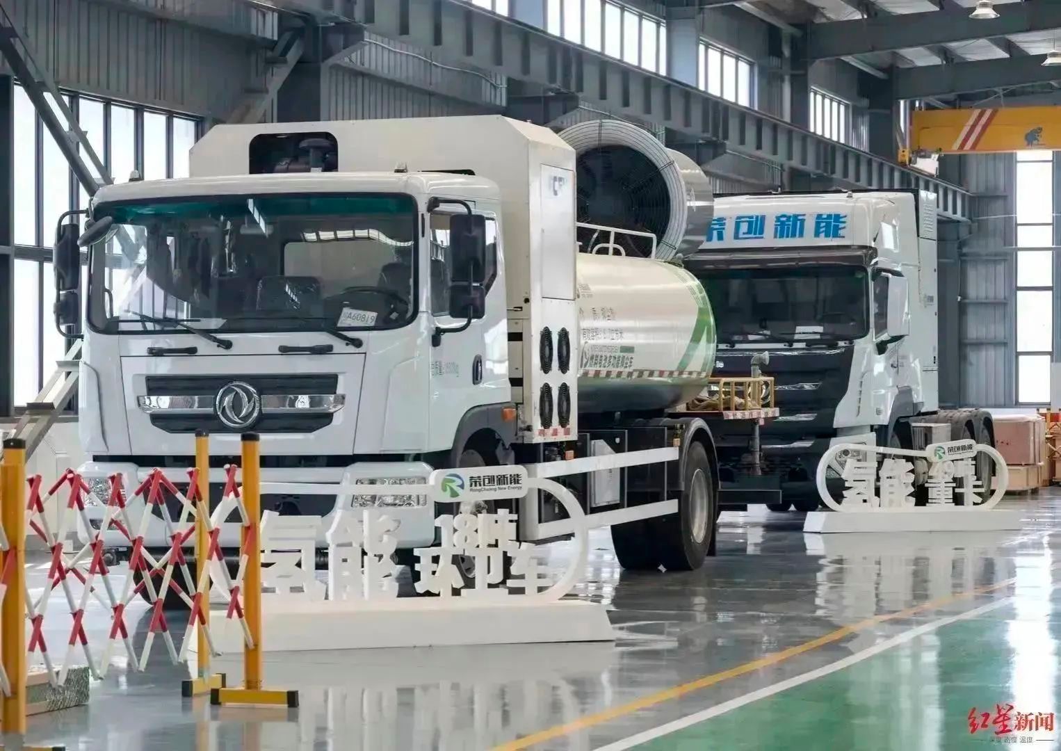 在汽车领域,荣创新能48吨重卡已经下线,产品的全系配套就在四川。与此同时,荣创新能为成都新都区研发的5台18吨环卫车也将马上交付。很快,市民就能在成都街头看到近零碳的氢能环卫车。