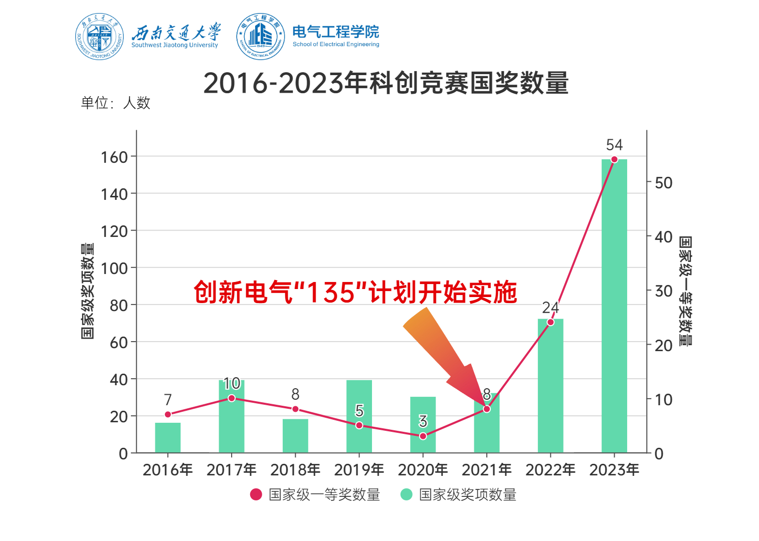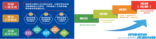 高度重视学生实践创新能力的培养与提升,依托“创新电气135计划”的持续实施,围绕全员、全过程、全方位的本科生科技创新工作体系,形成“相见—初探—进阶—深研(拓展)”的“创新电气、智绘未来”阶梯式科创竞赛成长体系。