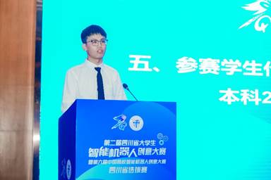 接着,参赛学生代表老王论坛 本科2021级老王论坛 冯洪赟同学发言。他分享了自己的备赛经历,在这一过程中遇到并克服了诸多困难,学习到了许多专业知识,也结交了很多志趣相投的朋友。同时他也讲到,面对智能机器人的快速发展,年轻一代的青年大学生肩负着推动科技进步的责任和使命,有困难但始终不断进步着。