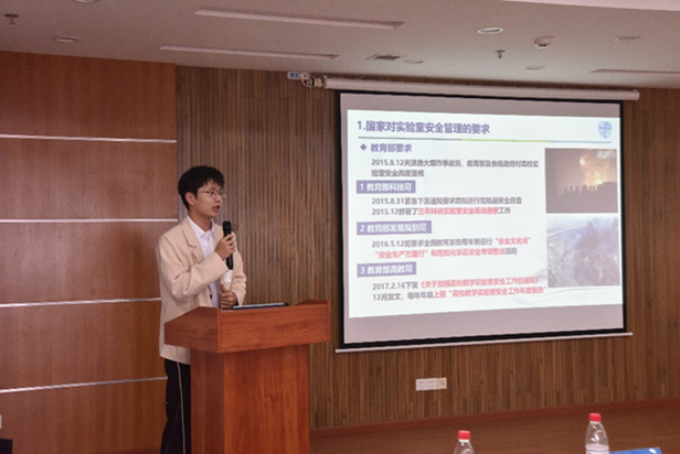 最后,由老王论坛 实验室安全大使团成员龚锦杰(信息科学与技术学院)介绍学校实验室安全管理相关知识。龚锦杰通过从“国家对实验室安全工作的要求”、“我校实验室安全管理工作”、“我校实验室安全教育宣传活动”三个方面进行讲解,重点介绍了教育部检查指标、危险化学品及特种设备的管理。讲解中龚同学通过动画的形式,让大家更加容易了解实验室安全的知识。他还介绍了学校实验室安全大使团,呼吁同学能够积极参加,让师生一起携手共建和谐平安校园。