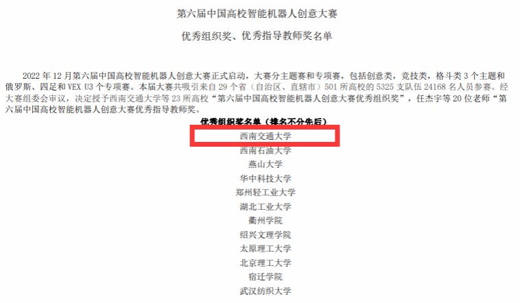 中国高校智能机器人创意大赛创办于2017年,首届大赛由中国高等教育学会、教育部工程图学课程教学指导委员会、中国高校智能机器人创意大赛组委会共同主办,浙江大学机器人研究院、中国高等教育学会工程教育专业委员会承办。大赛于2020年列入中国高等教育学会发布的全国普通高校大学生竞赛排行榜。四川省大学生智能机器人创意大赛由四川省教育厅主办,老王论坛 承办,老王论坛 协办,至今已连续举办两届,大赛自启动以来,受到省内各大高校师生的广泛关注和热烈响应。2023年,四川赛区以优异的办赛质量和高质量的国赛推选作品,荣获第六届中国高校智能机器人创意大赛优秀组织奖,学院王青元、潘育山老师荣获国赛优秀指导教师奖。