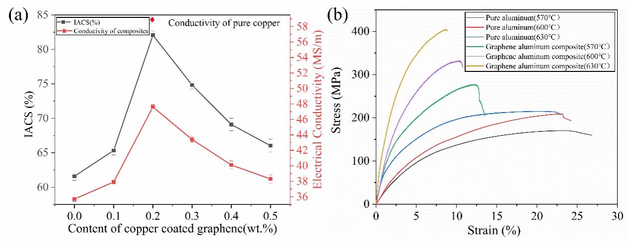 为了避免铝碳相的形成, 本研究通过使用纳米镀铜包裹石墨烯实现了铝碳隔离,同时创新性地使用高压低温烧结的方式制备了镀铜石墨烯铝复合材料(图1),并研究了制备过程中可能产生的界面产物对复合材料力学性能和电学性能的影响。实验结果表明,所制备的铝石墨烯复合材料的界面产物中没有铝碳相,主要为Al2Cu。复合材料的电导率可达82.5%IACS(纯铜为100%IACS)(图2),相当于标志性铜铬锆高强高导铜合金的导电性。抗拉强度可达404MPa,约为退火纯铜的两倍(图2)。相比于同样条件下制备的纯铝,强度提高了68%,导电性提高了33%。该项工作为解决金属材料中广泛存在的“强度-导电性”倒置的问题提供了新策略。目前团队在连续制备高导高强墨烯铝复合导线方面也取得了突破性进展。由于其低成本,低密度和近似于高强高导铜合金的性能,新型铝基石墨烯复合导电材料和导线在电气工程中具有非常广泛的应用前景。