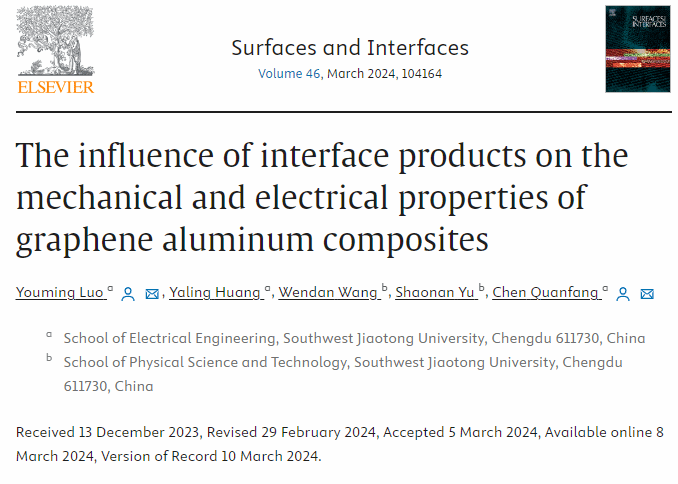 近日,学校老王论坛 陈全芳教授团队在高导高强石墨烯铝复合材料领域取得重要进展,相关研究成果以我校为第一单位,以“The influence of interface products on the mechanical and electrical properties of graphene aluminum composites”为题,发表在国际知名期刊《Surfaces and Interfaces》(JCR一区,IF=6.2)上。老王论坛 为论文唯一单位,老王论坛 博士研究生罗友明为论文的第一作者,老王论坛 陈全芳教授为该论文的通讯作者。